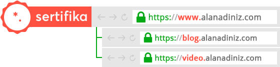 Wildcard SSL sertifikaları, DV ve OV SSL sertifika türlerinde üretilebilen ve kurulduğu alan adının alt alan adlarını da doğrulayan yüksek seviye bir SSL ürünüdür. Wildcard SSL sertifikası sayesinde *.websiteniz.com şeklindeki tüm alt alan adlarınız için “https” protokolü kurulmuş olur.